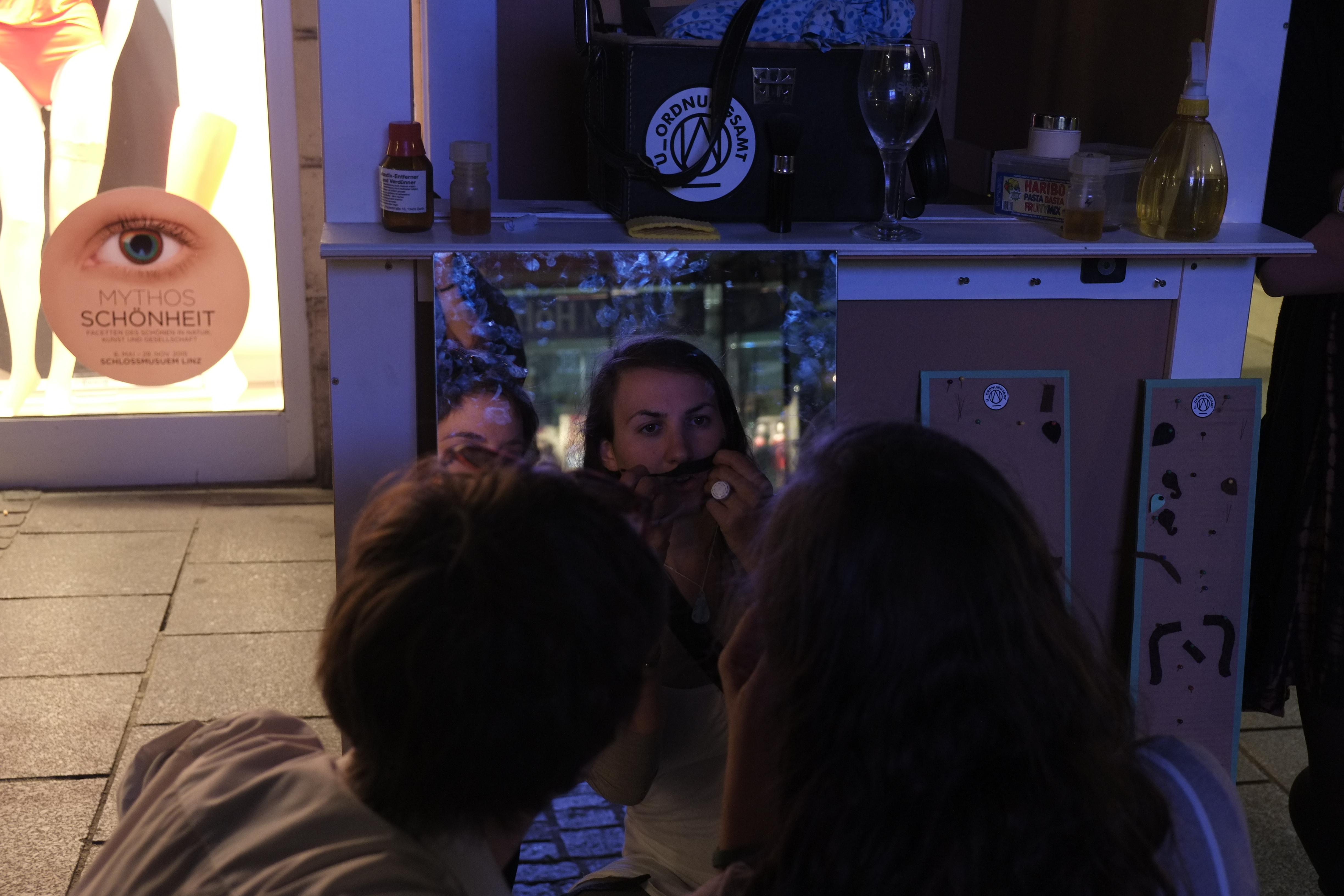 Ein gebauter Stand gab, neben den glaubwürdigen Kostümen, Mitarbeiterausweisen und der corporate identity (logo, Werbegeschenke, Broschüre) den Interventionen den nötigen „offiziellen“ Rahmen. Es gelang sogar die Anwerbung von neuen Mitgliedern für das U_Ordnungsamt mit Flüchtlingshintergrund. Im direkten Kontakt mit den Linzern wurde Alltag auf der Straße thematisiert und neu geschaffen – Fiktion wurde Realität – Realität auf ihren vordergründig unveränderbaren vs. gestaltbaren Charakter hin überprüft.