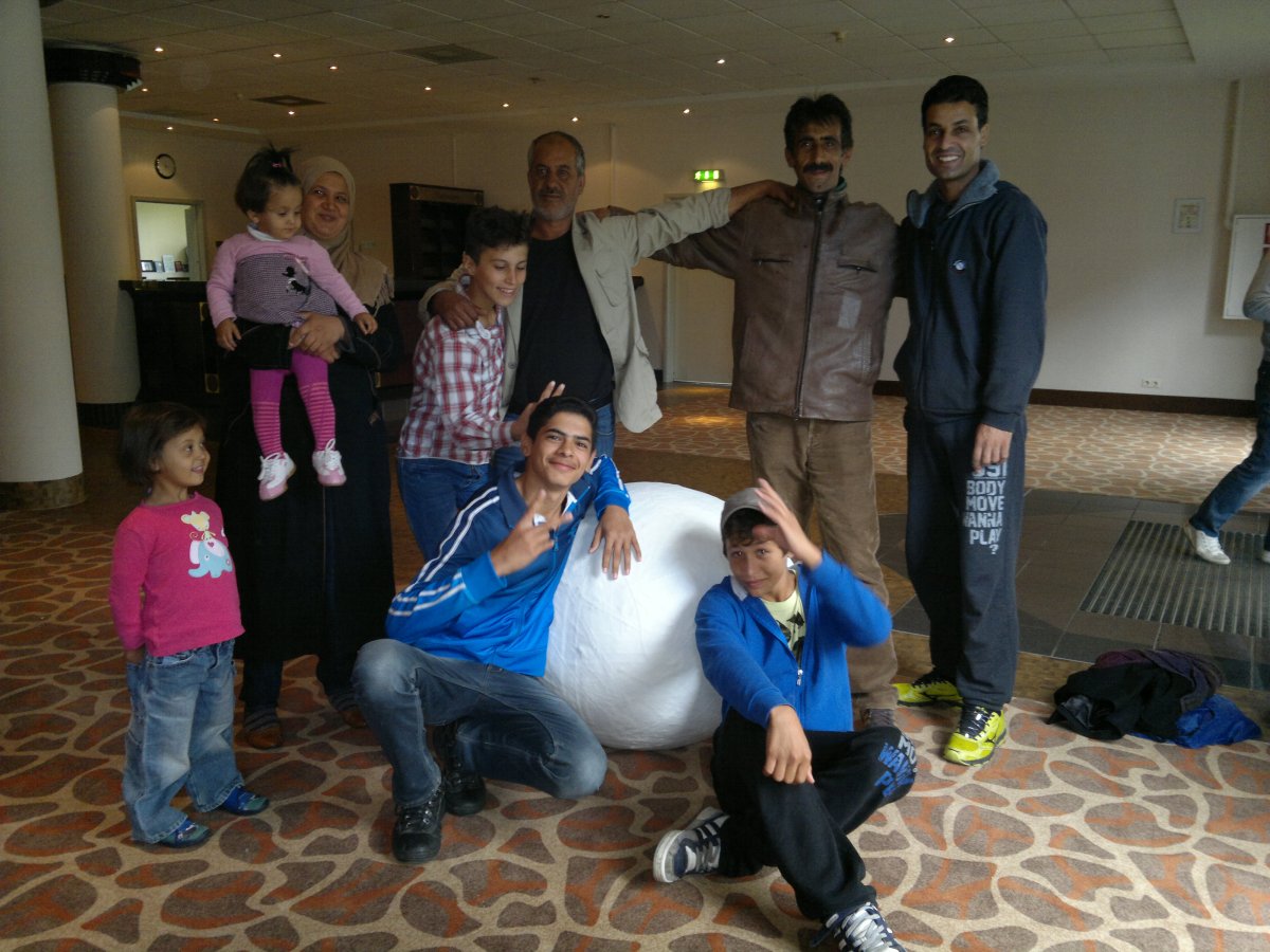 Geflüchtete im Hotel Ramada nehmen das Ei herzlich auf.