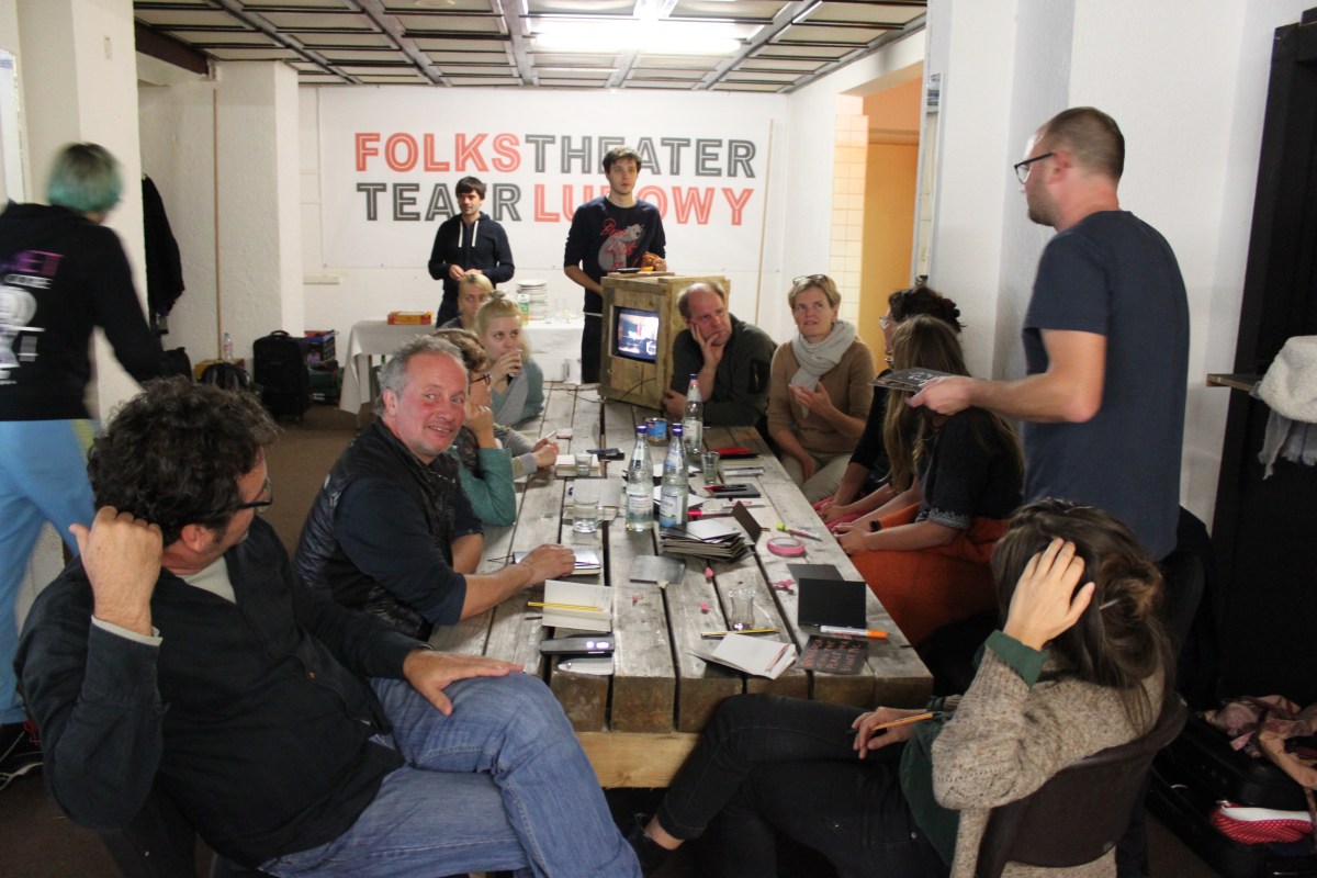 Eva Hertsch with a white scarf discusses issues of art in public spaces.
